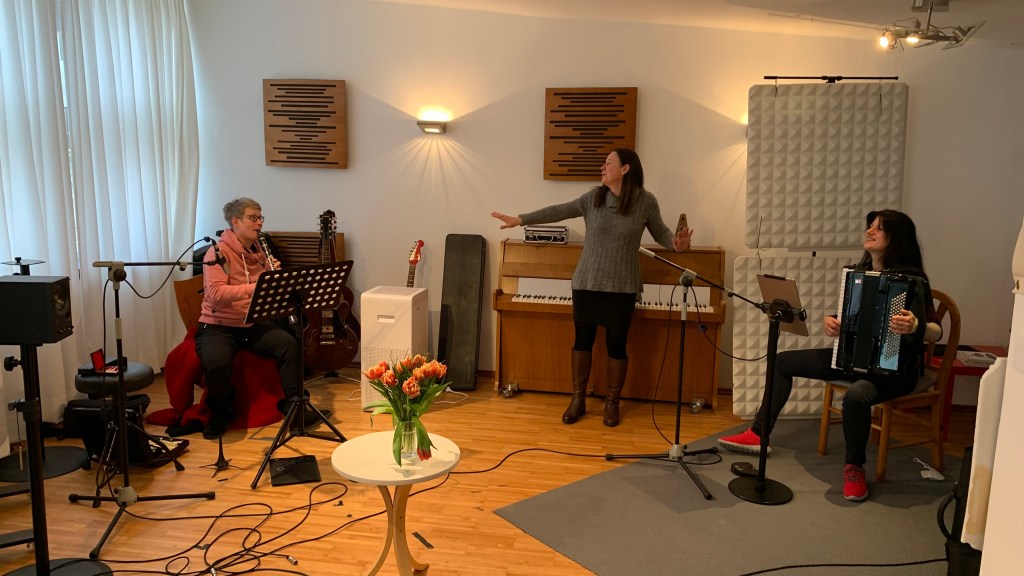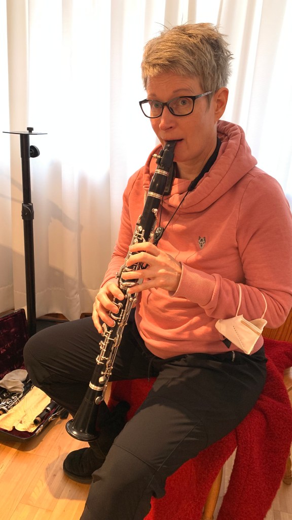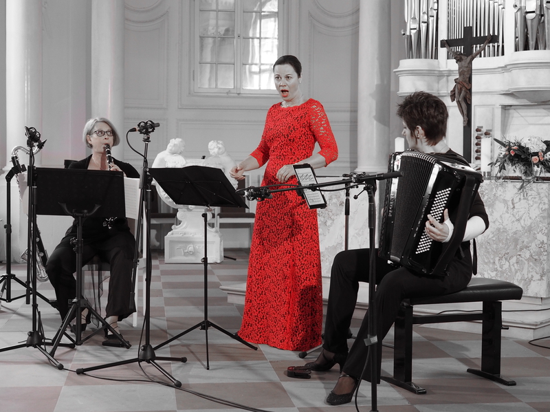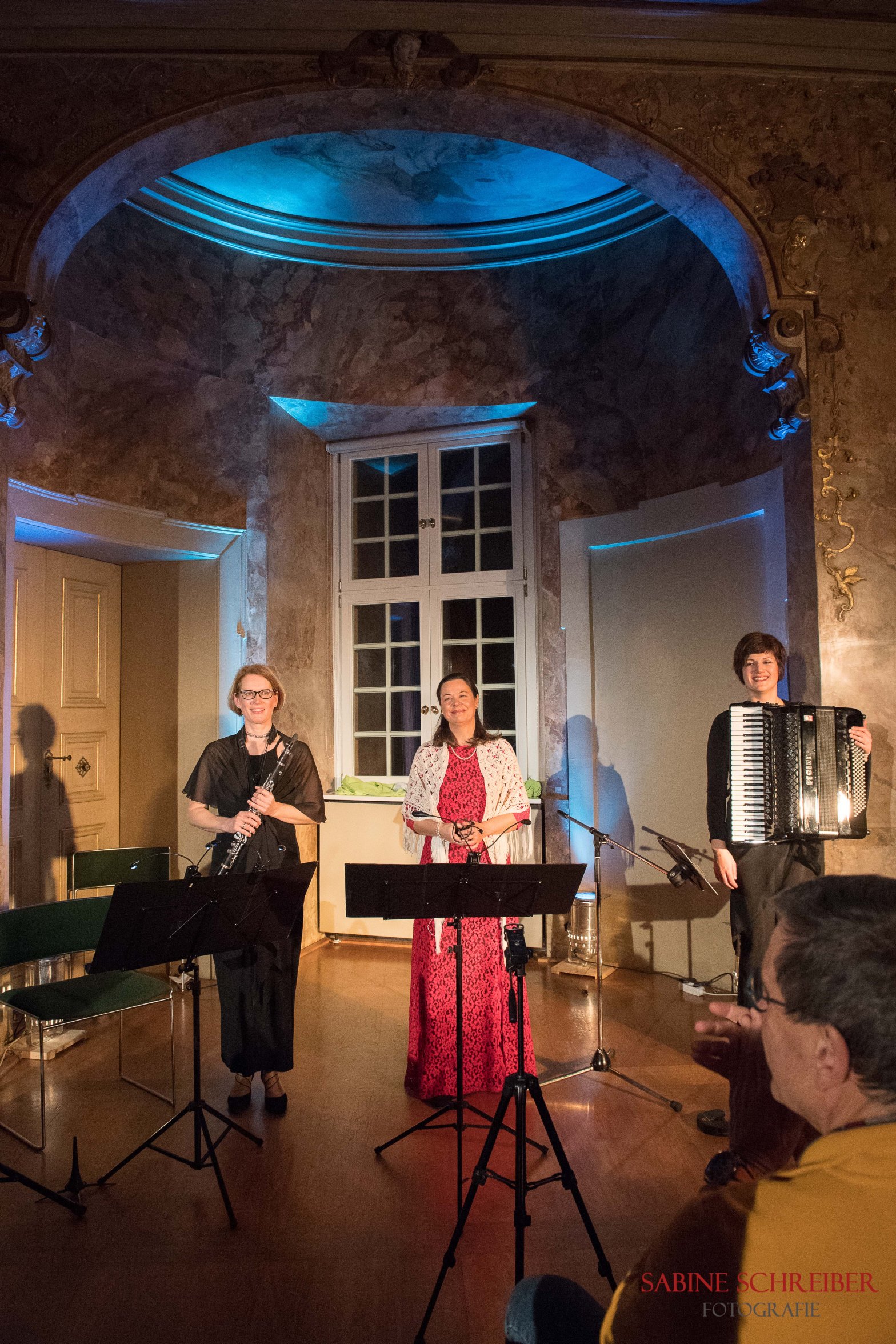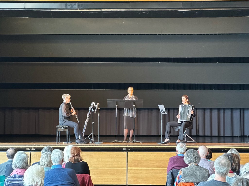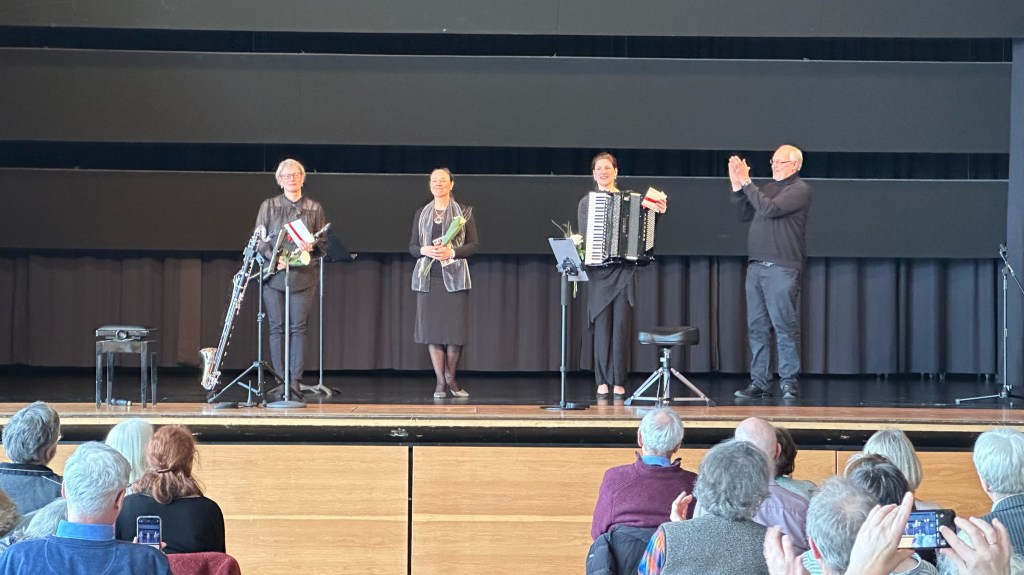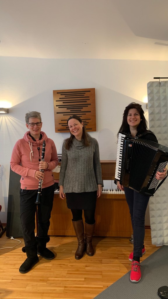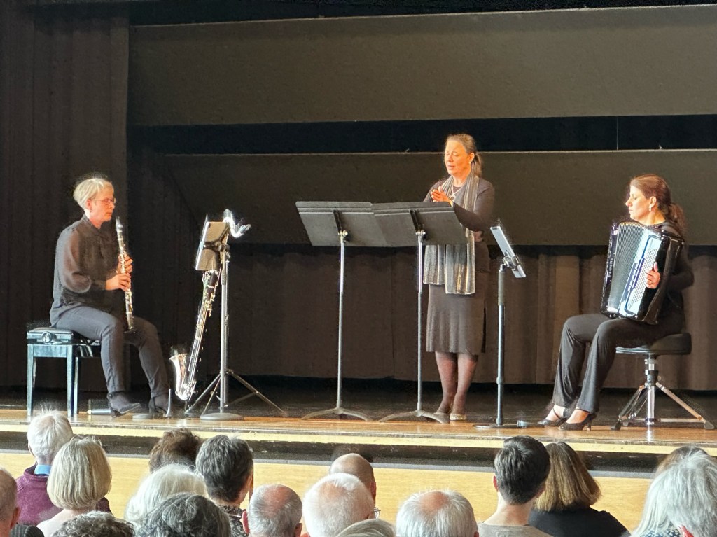 In verschiedenen Besetzungen wurde musiziert, und da sich das Trio aus dem langjährigen „Duo Áne“ und Sopran gebildet hat (daher der Ensemblename), gab es auch Tangos von Ástor Piazzolla aus dem aktuellen Programm von D´Ané zu hören. Ebenfalls interessant zu hören – und zu sehen – waren Mundharmonika (Anna Escala) sowie erstmals Bassklarinette (Elke Bürger).